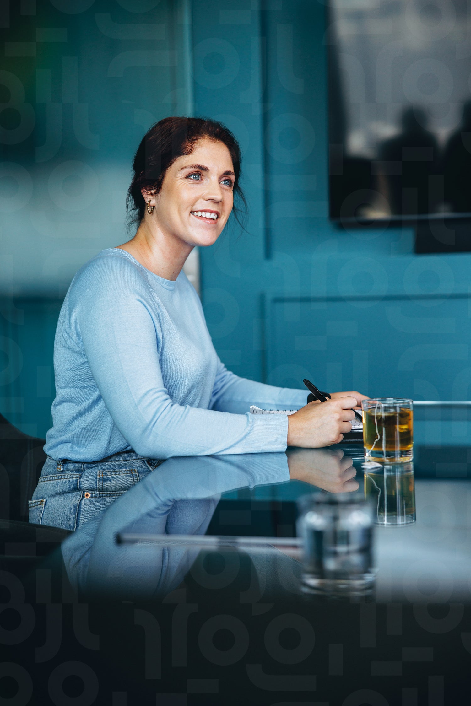 Professional woman writes down notes during a business meeting. Happy and young business woman sitting in a boardroom, paying attention to the agenda and contributing to the discussion.