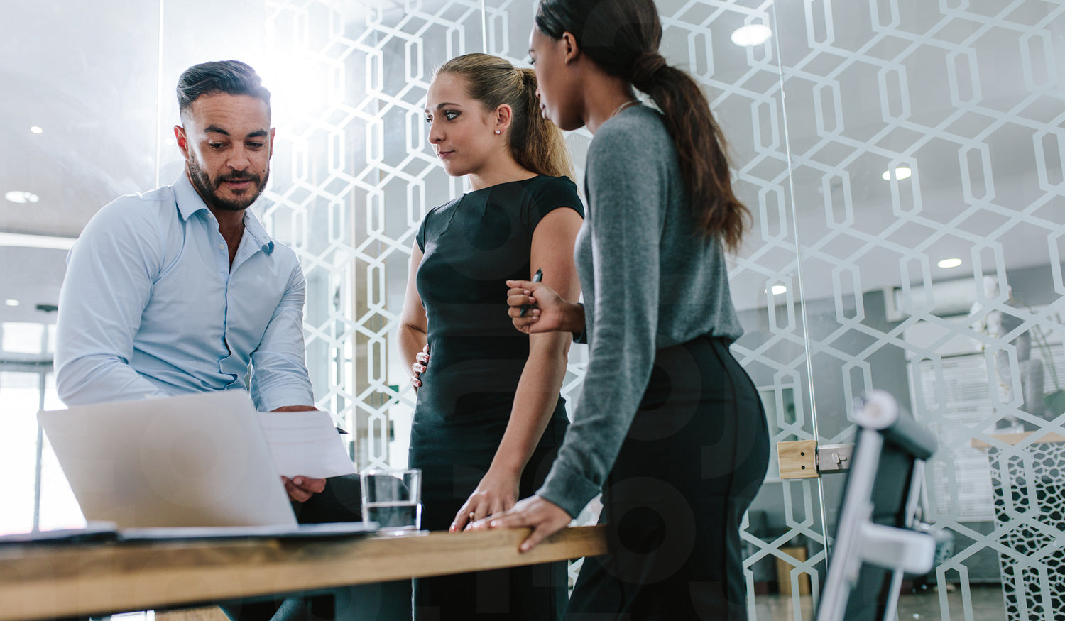 Multi-ethnic business professionals discussing over a document boardroom. Business colleagues working on their new business plan together at office.