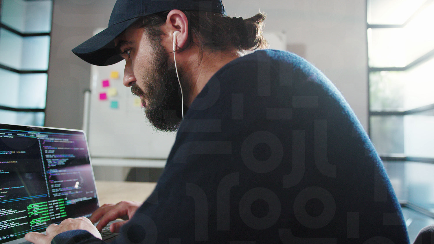 Programmer creating a computer code in an office. Male software developer sitting and working on a laptop. Young business man working in a tech company.
