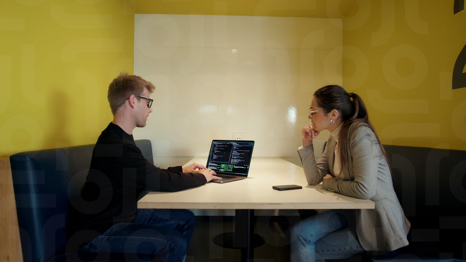 Programmers working on a code and having a discussion in an office