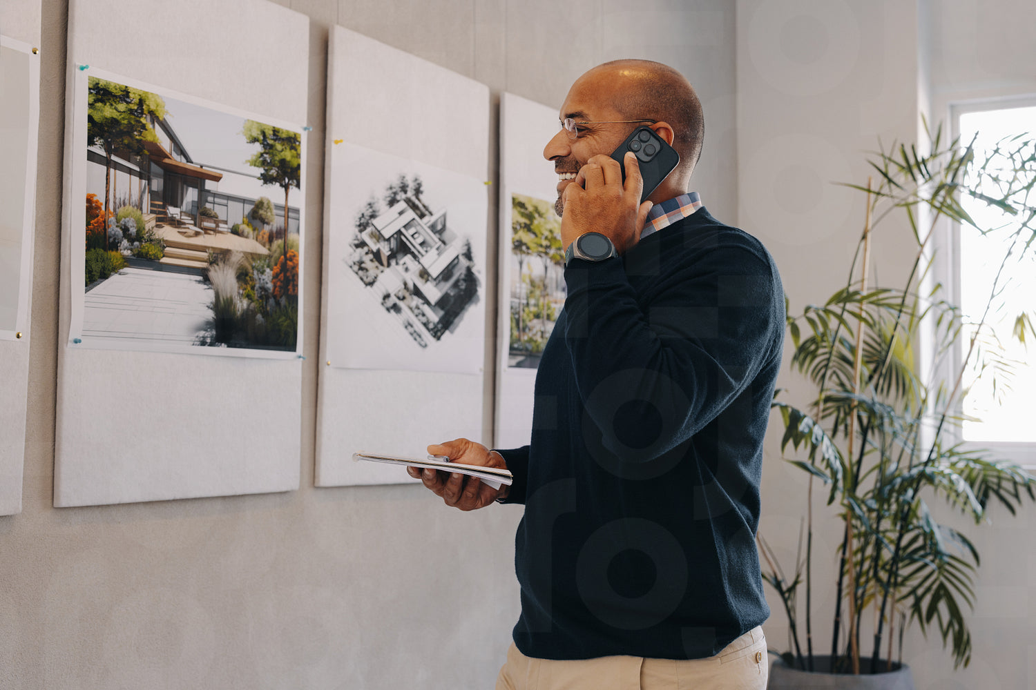 A dedicated project manager talks on the phone while examining design plans pinned on a wall. The setting portrays a professional environment with a focus on architecture and client interaction.