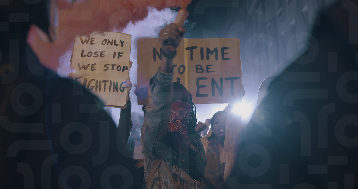 Protestors demonstrating with smoke bombs in front of police force at night. Anti-government protest by a group of social activists group.