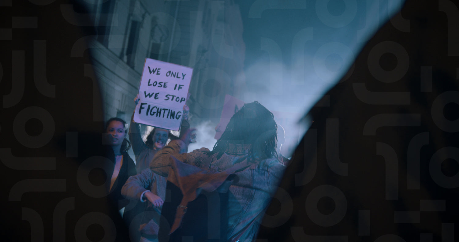 Group of furious protestors giving slogans in front of the security forces. Group of men and women demonstrating against police violence at night.