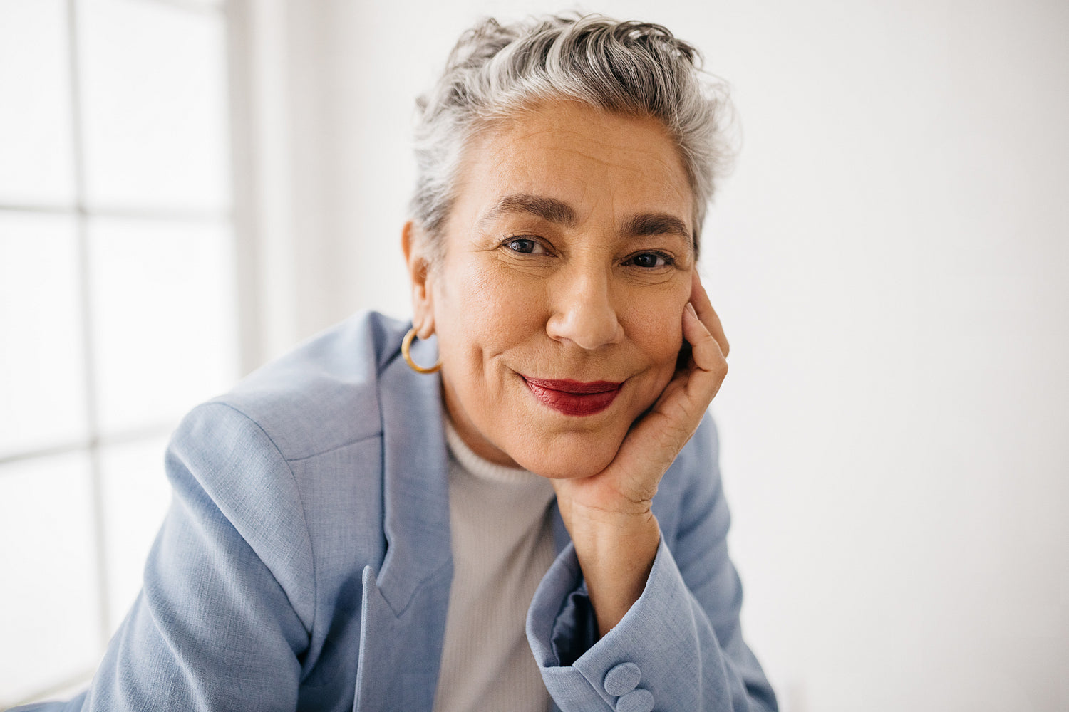Proud business woman with grey hair sitting in her office dressed in a professional suit