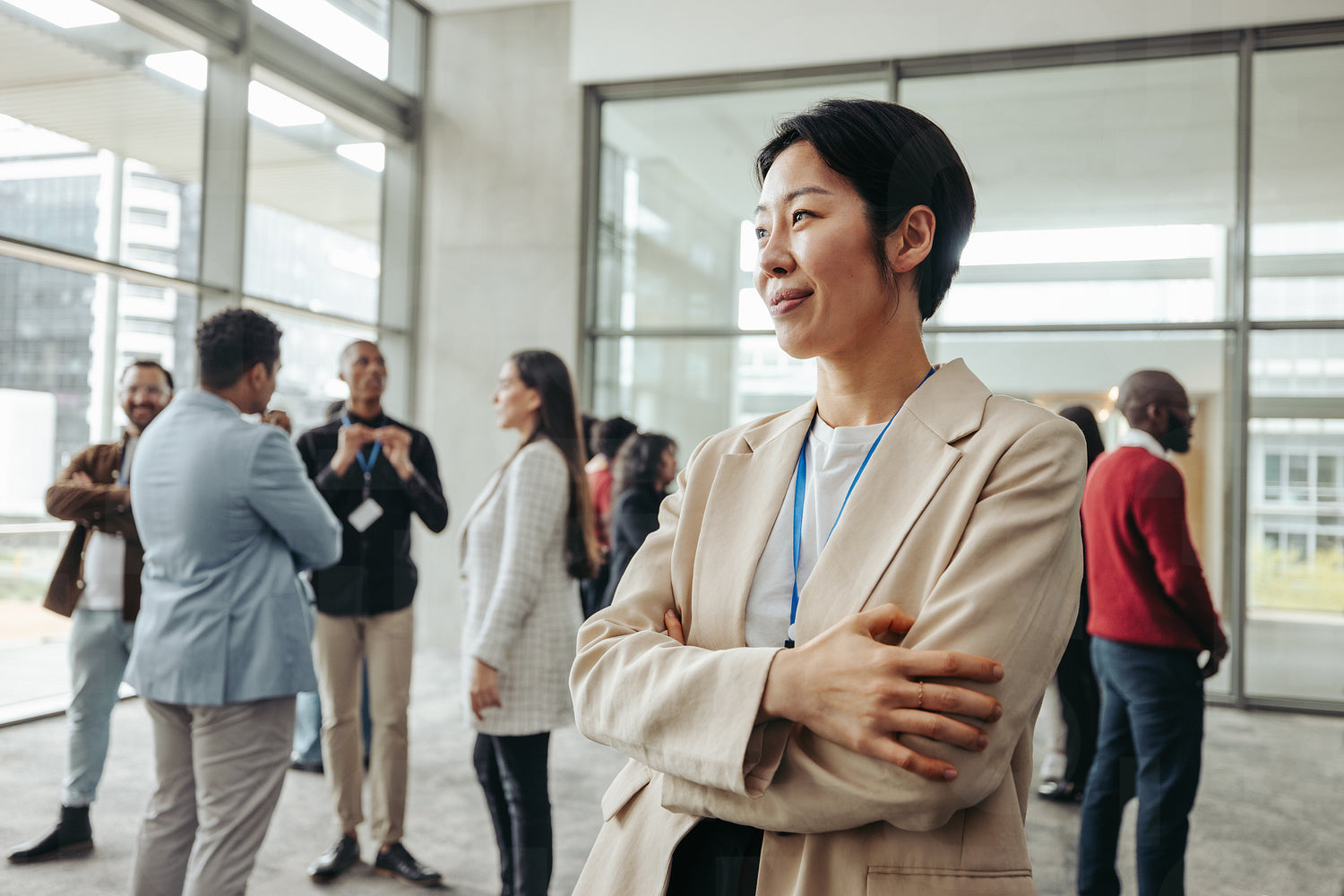Quiet confidence: Professional woman in office networking with colleagues