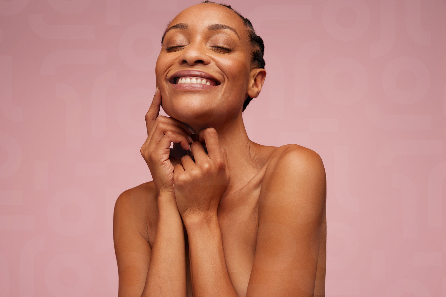 African american woman with clean and clear skin smiling on pink background. Female model with glowing and perfect skin.