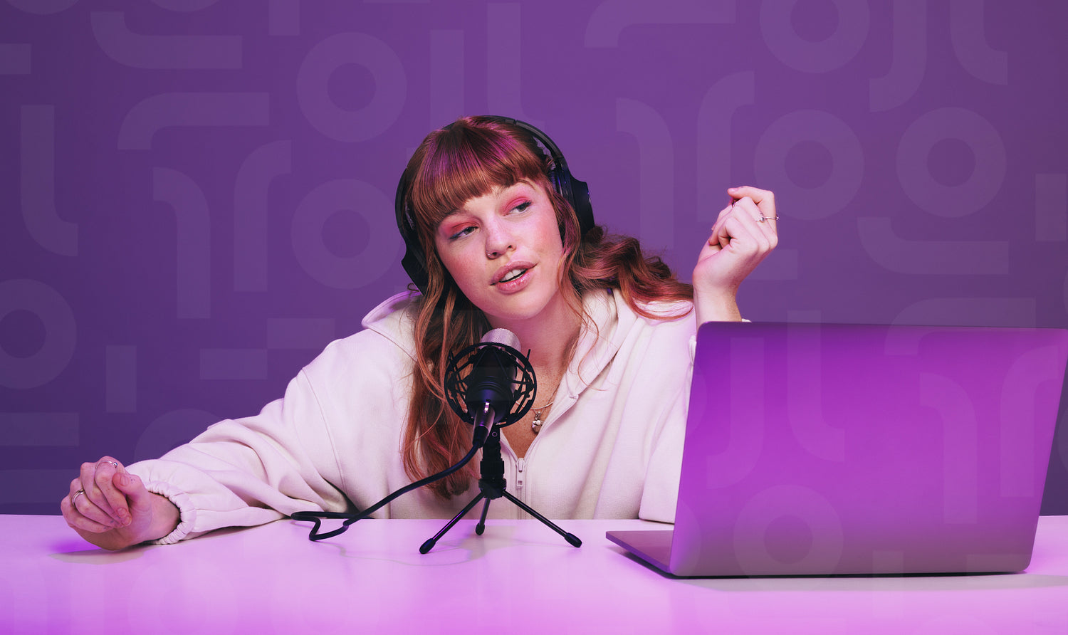 Young woman speaking into a microphone while hosting a live radio show. Female podcaster recording an audio broadcast in neon purple light. Woman creating content for her internet podcast in a studio.