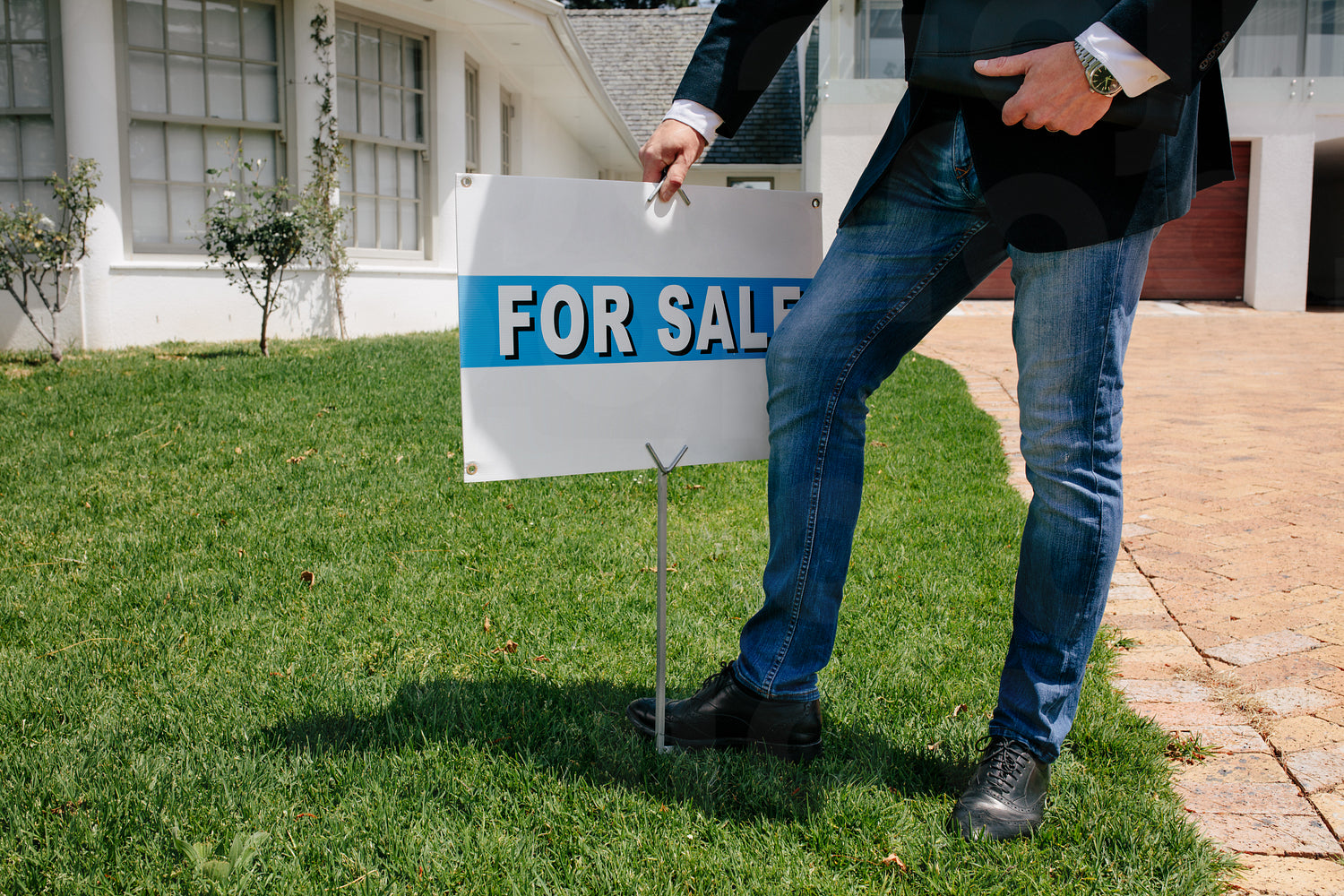 Realtor with a for sale sign board outside a house. Male Real Estate broker with for sale notice in lawn of a new house.