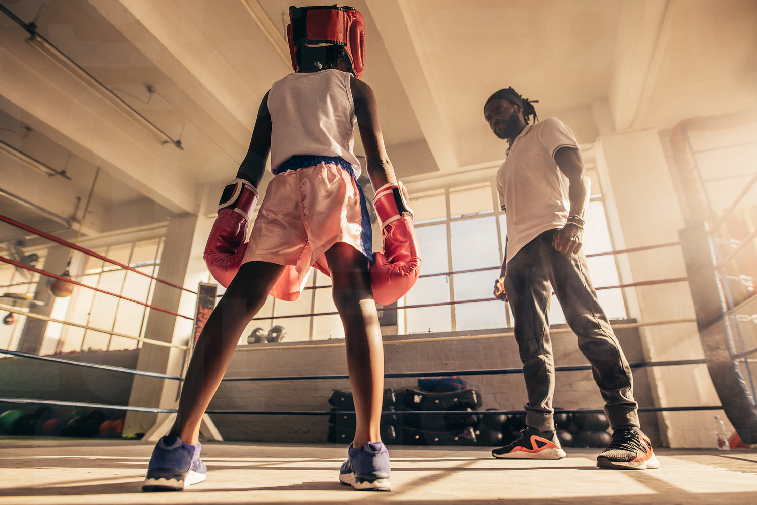 Rear view of a boxing kid standing inside a boxing ring with his trainer