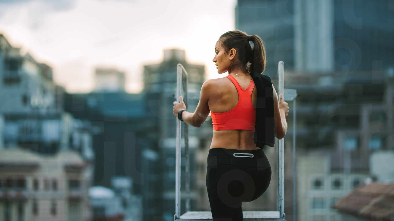 Female athlete standing on rooftop staircase looking away. Woman in fitness wear climbing down a rooftop staircase.