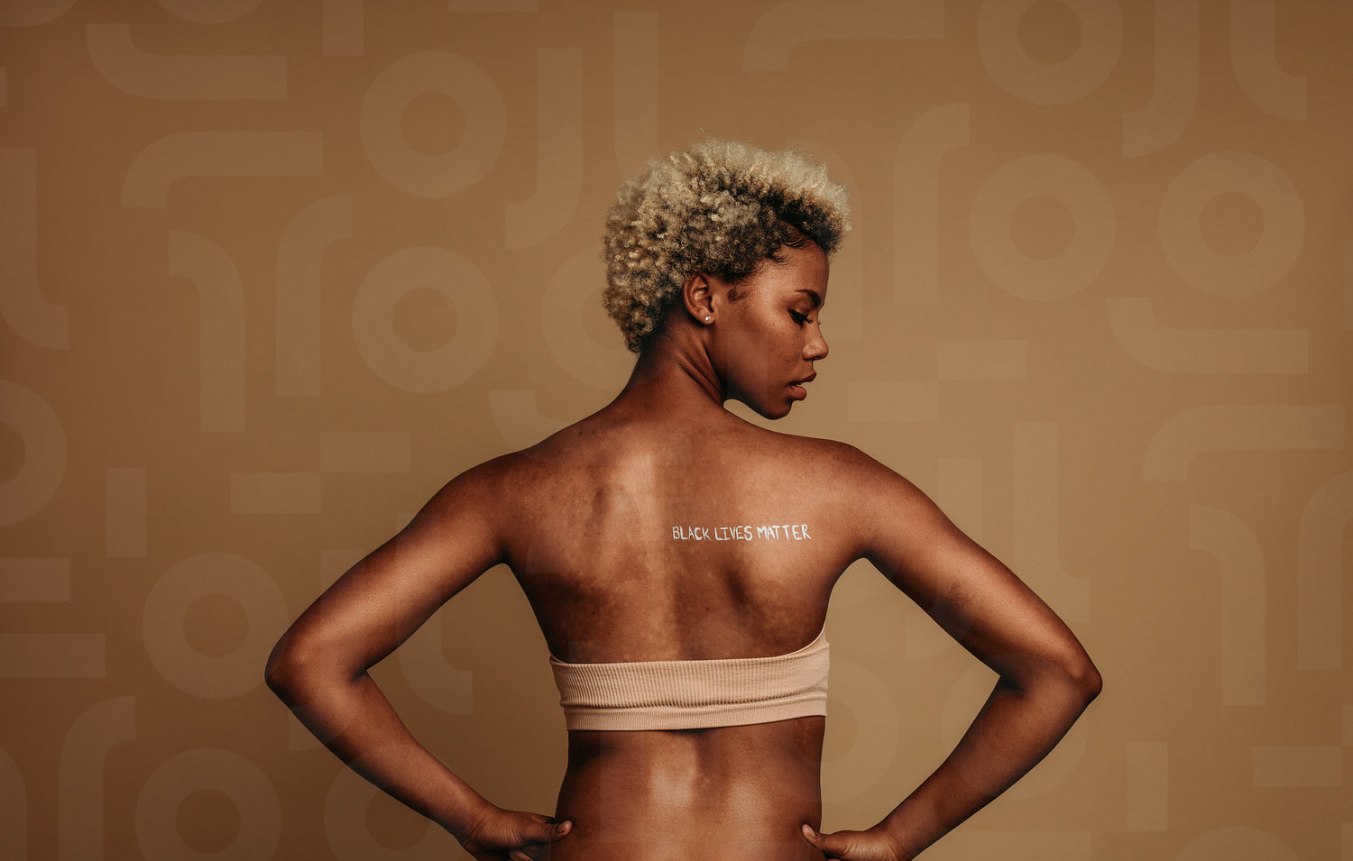 Woman activist with words black lives matter painted on back. African american woman protesting against racism.