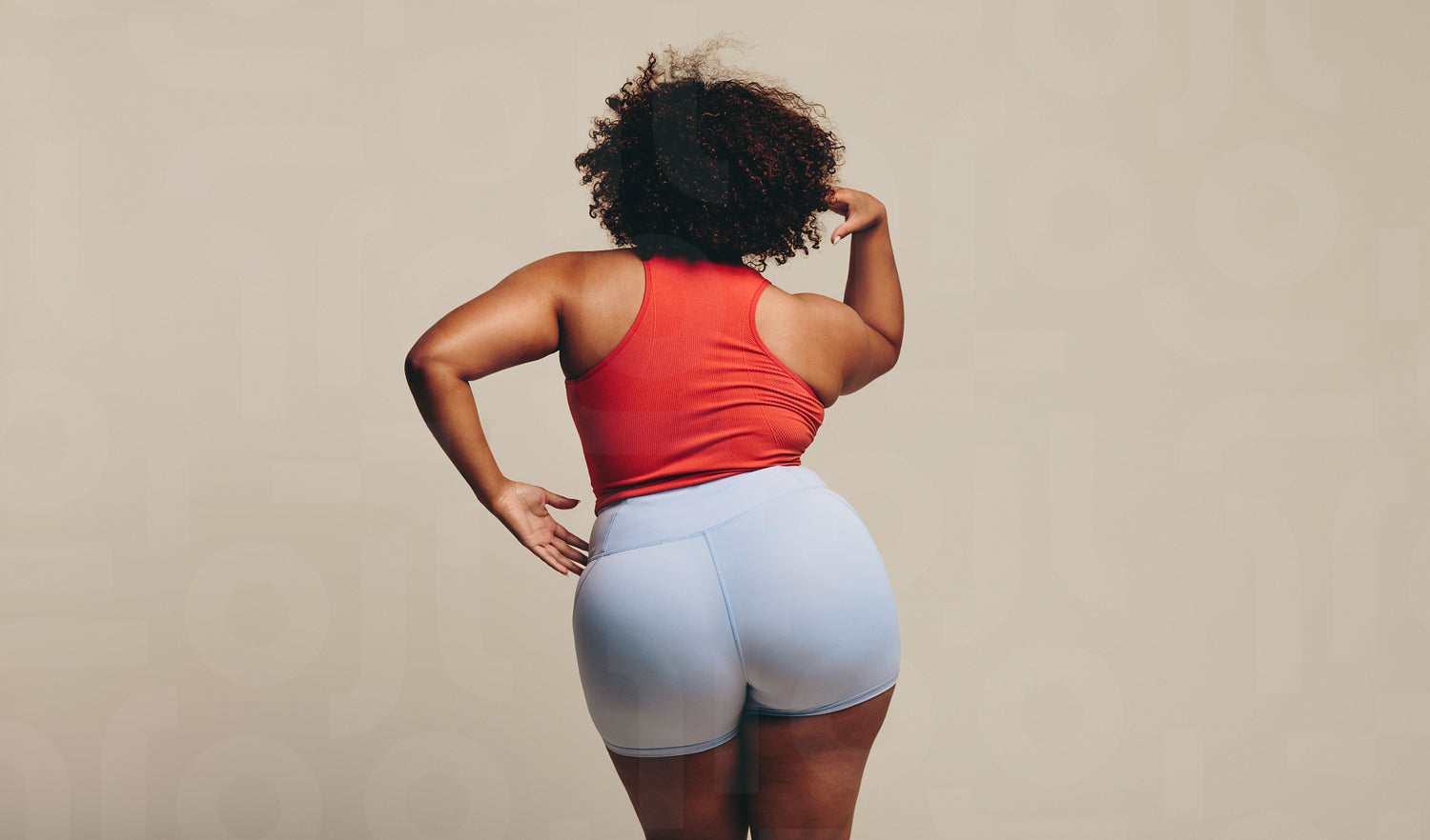 Rearview of a body confident woman standing in a studio, wearing sportswear
