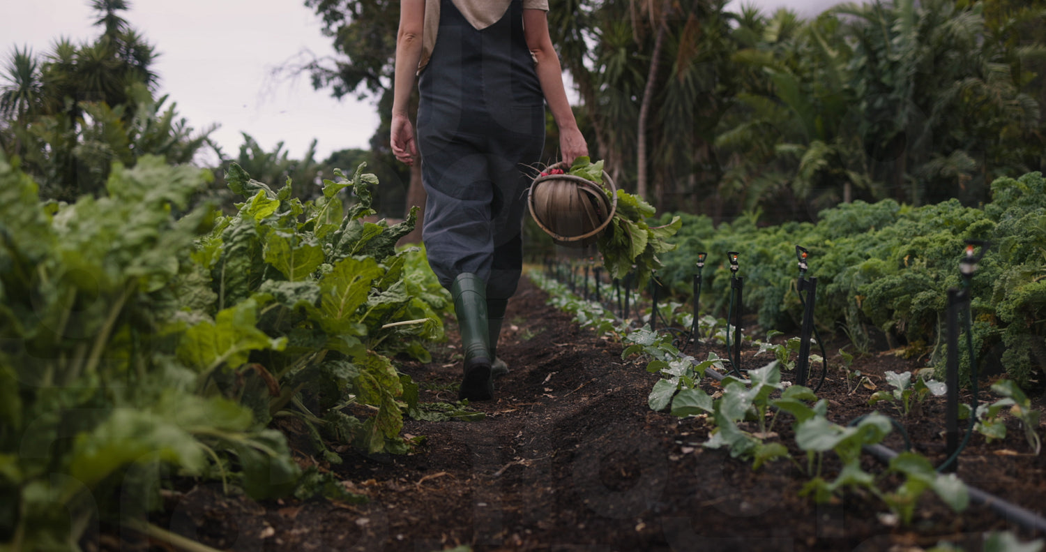 Rearview of an organic farmer carrying a basket full of freshly picked vegetables on her farm. Self-sufficient female farmer walking through her garden while harvesting vegetable produce.