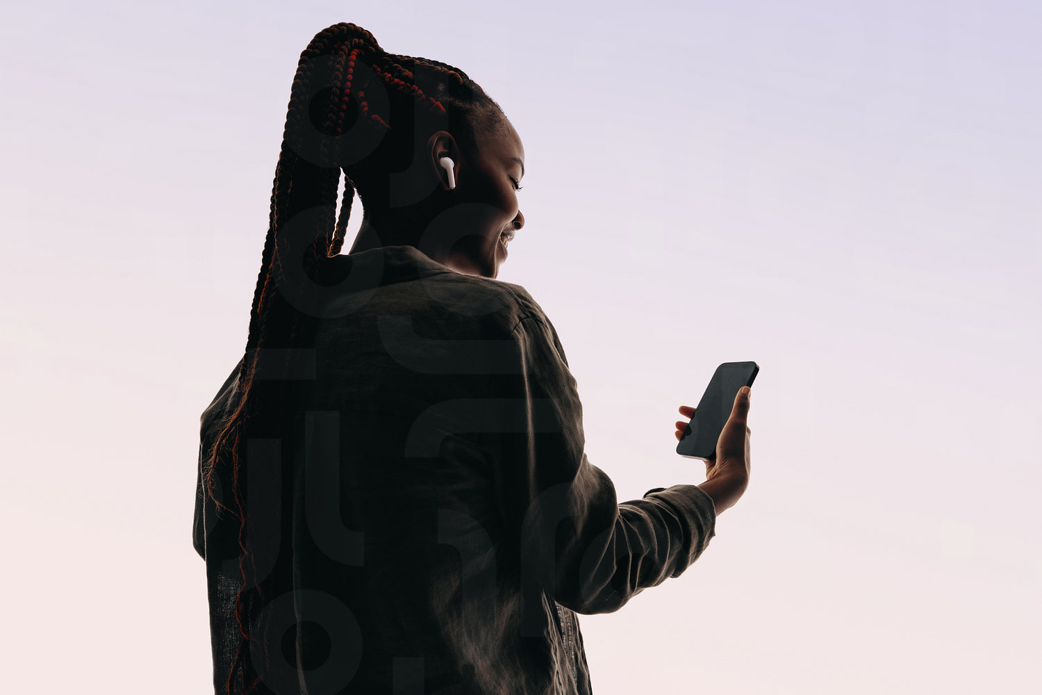 Young woman in her 20s stands in a studio, wearing a denim jacket and stylish braids. She holds a smartphone, engaged in a video call using a mobile app. With a happy smile, she embodies the connected lifestyle of online communication.