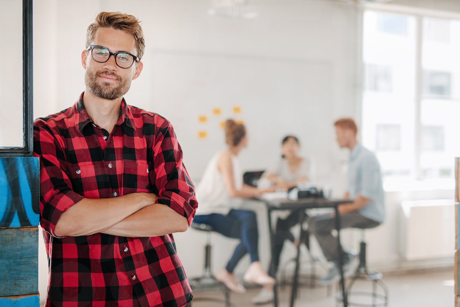 Portrait of relaxed young man standing in office with colleagues meeting in background.