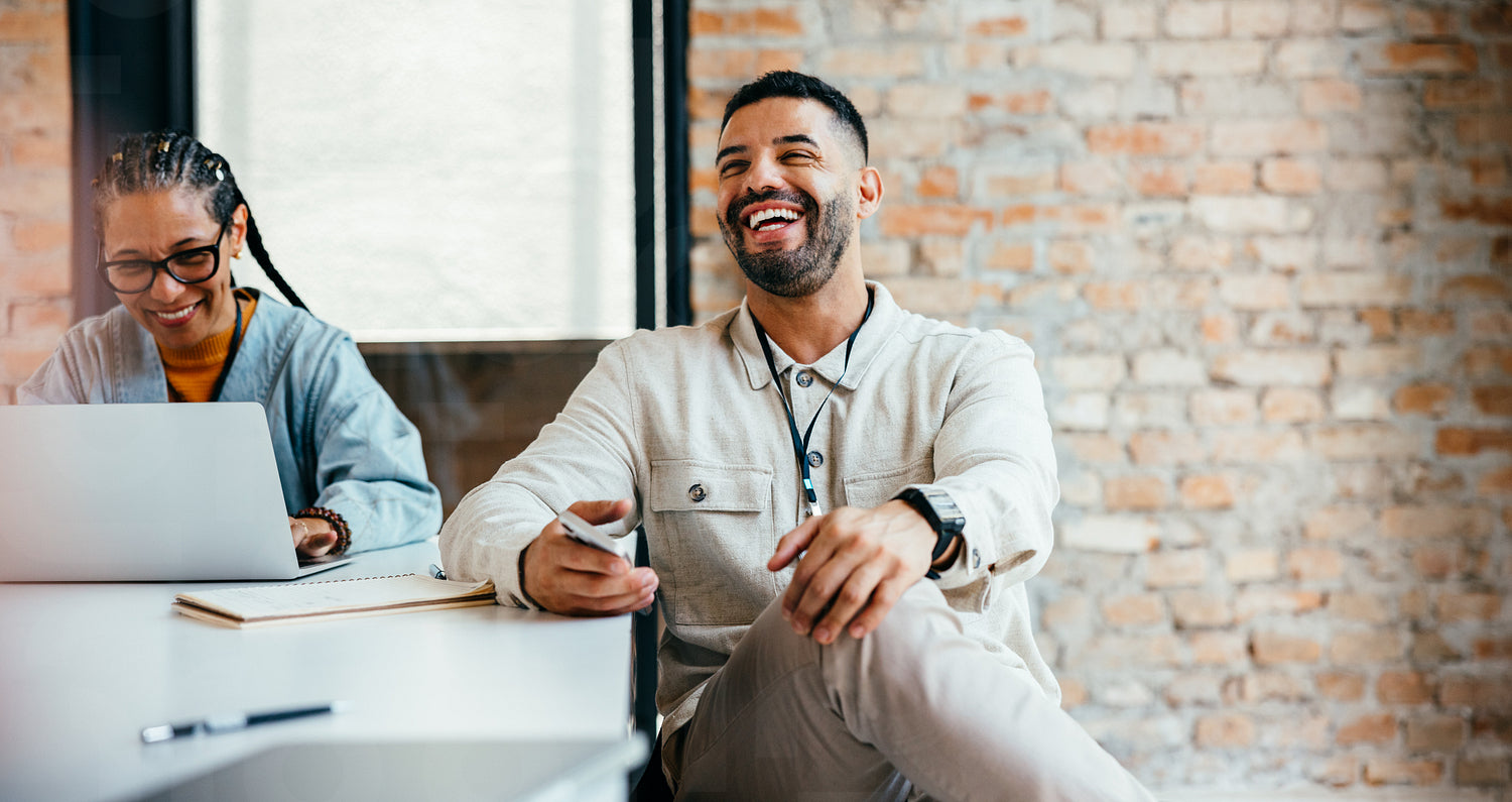A relaxed businessman laughs with a colleague during a casual meeting, illustrating a positive, collaborative atmosphere in a contemporary office with brick walls.