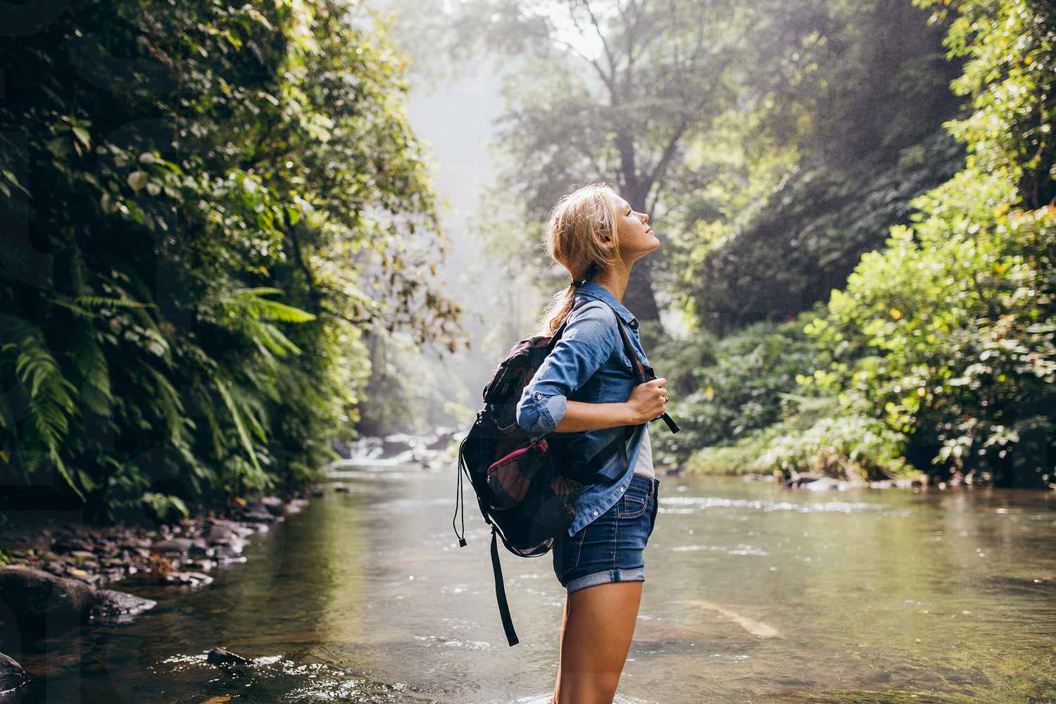Side view shot relaxed young woman with backpack standing by the stream. Female hiking by the creek.