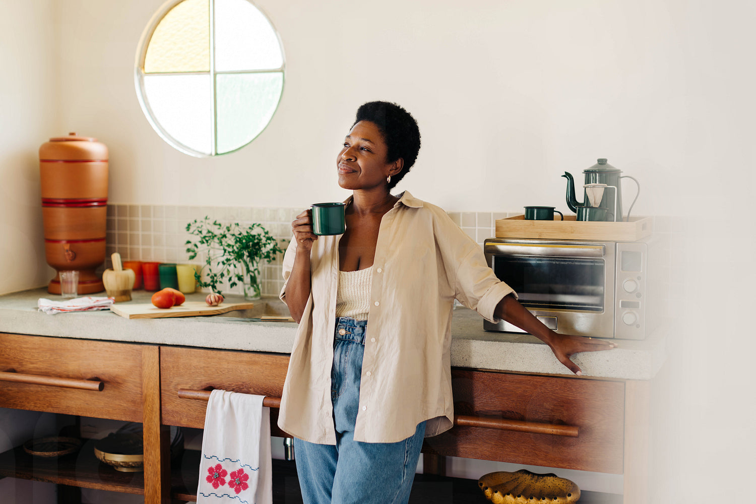 Relaxed black woman with afro hair standing in a kitchen, holding a cup of hot Brazilian coffee. She looks away thoughtfully, enjoying a hot drink in a cozy, homey setting.