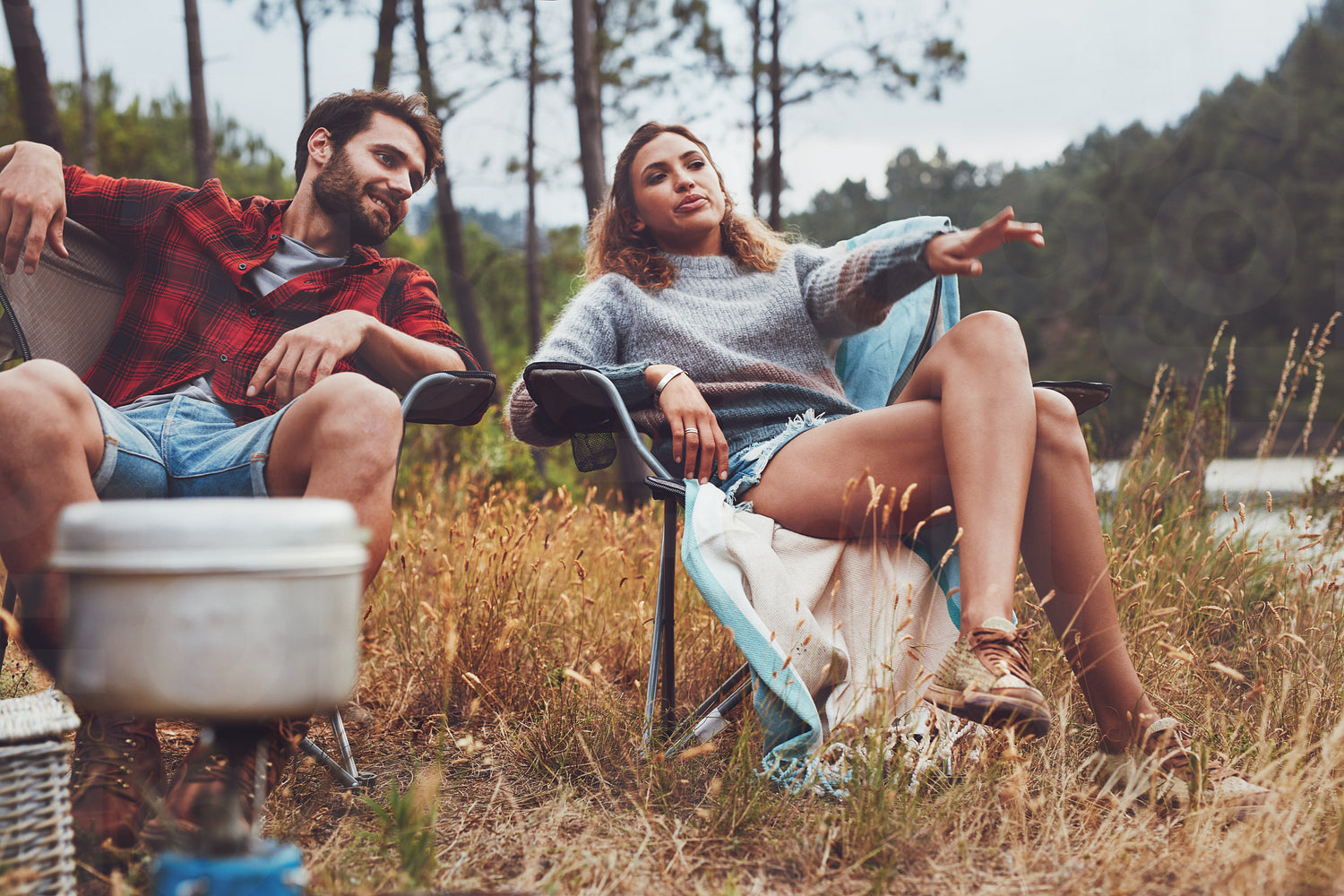 Relaxed young couple camping by the lake. Young woman pointing at her view while sitting with her boyfriend at their campsite.