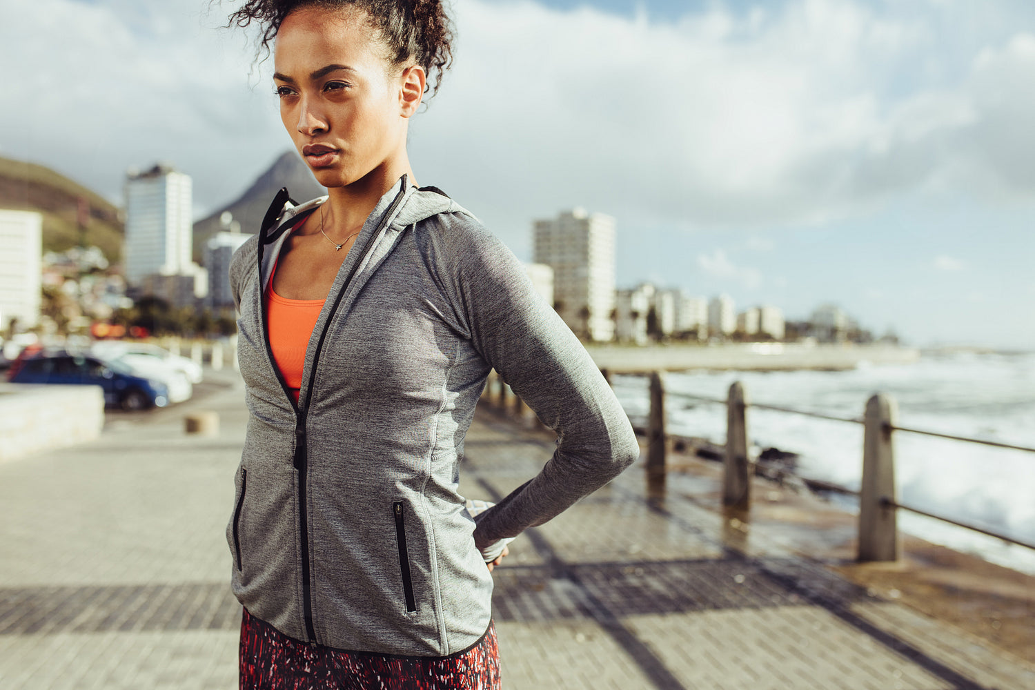 Fit young woman stretching her leg at seaside promenade. Healthy young female relaxing her leg muscles before a run.