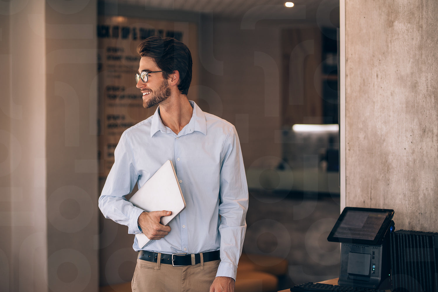 Young man standing in a cafe and looking away. Male restaurant manager with a laptop.