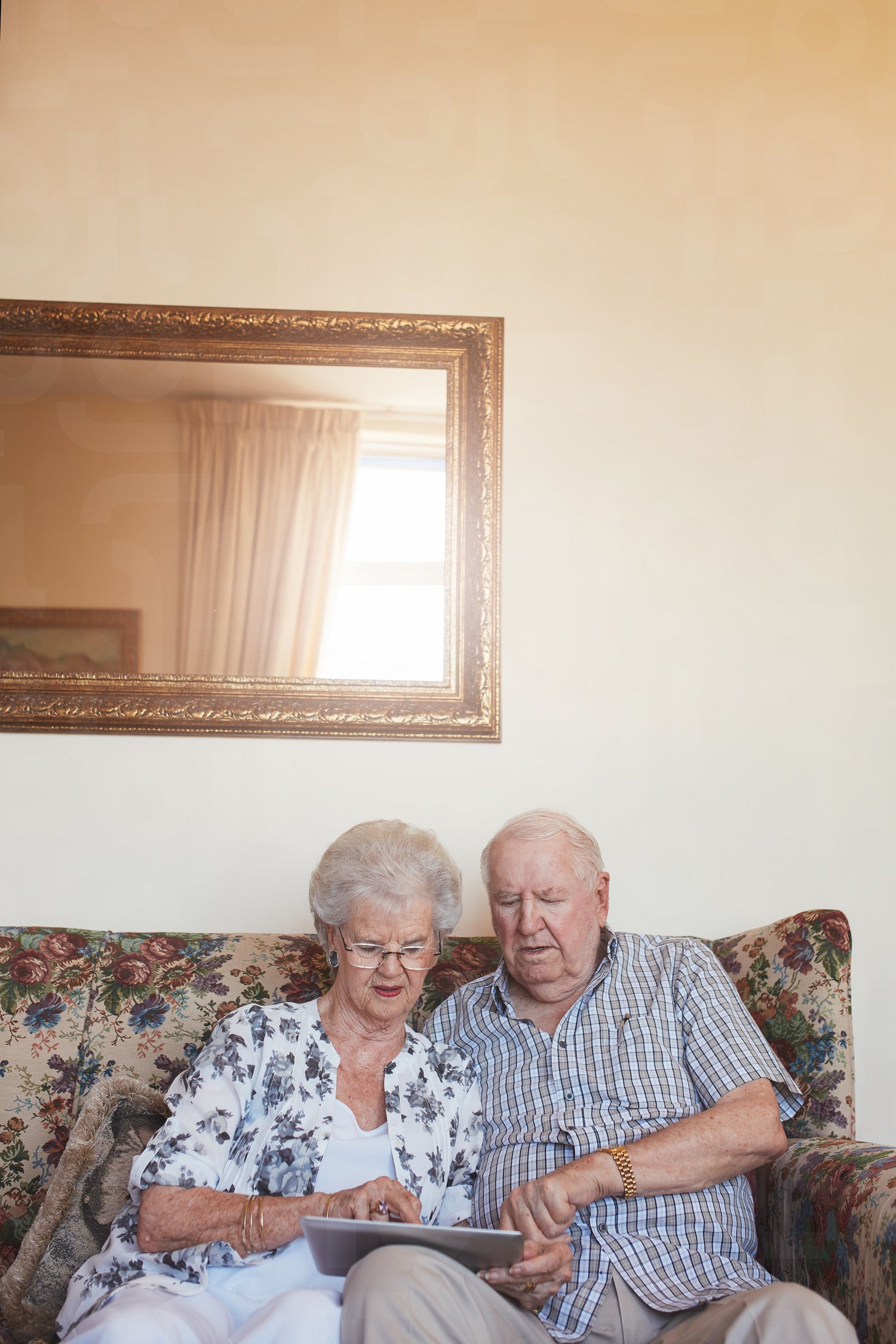 Vertical indoor shot of retired couple at home using digital tablet. Senior caucasian man and woman sitting together on sofa at home with a touch screen computer.