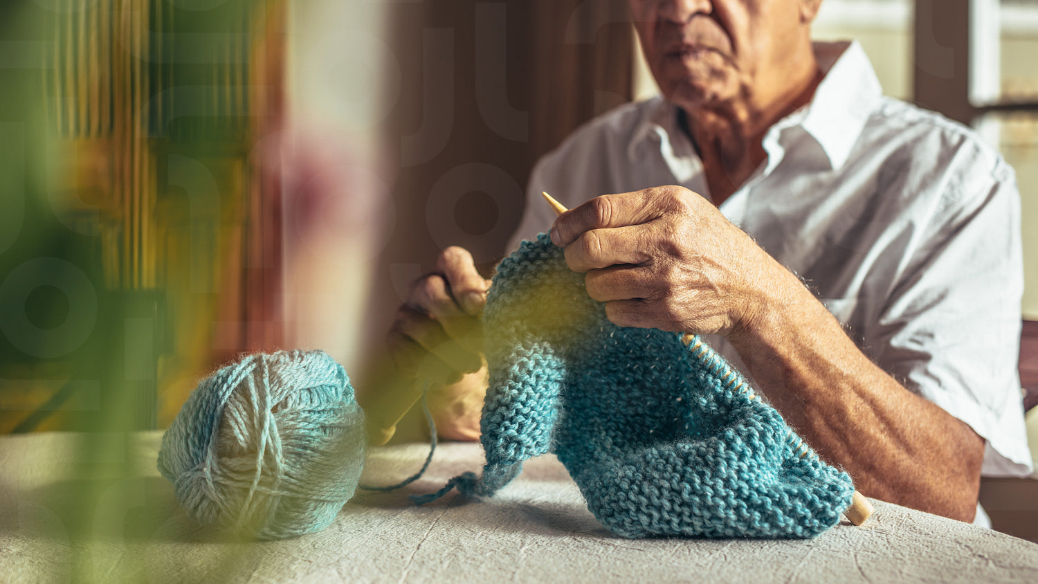 Close up of old man hands knitting with needles and wool yarn. Retired man knitting at home.