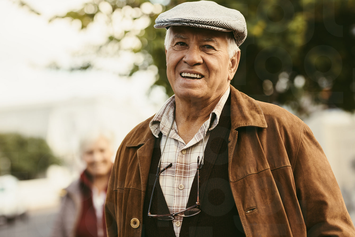 Portrait of happy senior man in warm clothes and cap looking at camera with a woman in background. Retired man standing outside on street on a winter day.