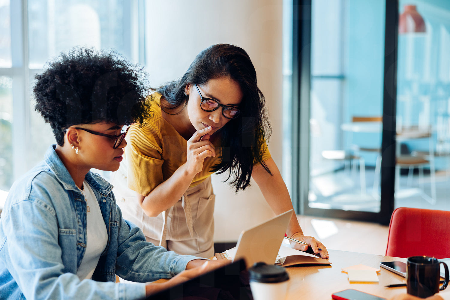 A young Black woman explains her work at the laptop while a professional woman leans in to review the details, creating a moment of focused collaboration in the office.
