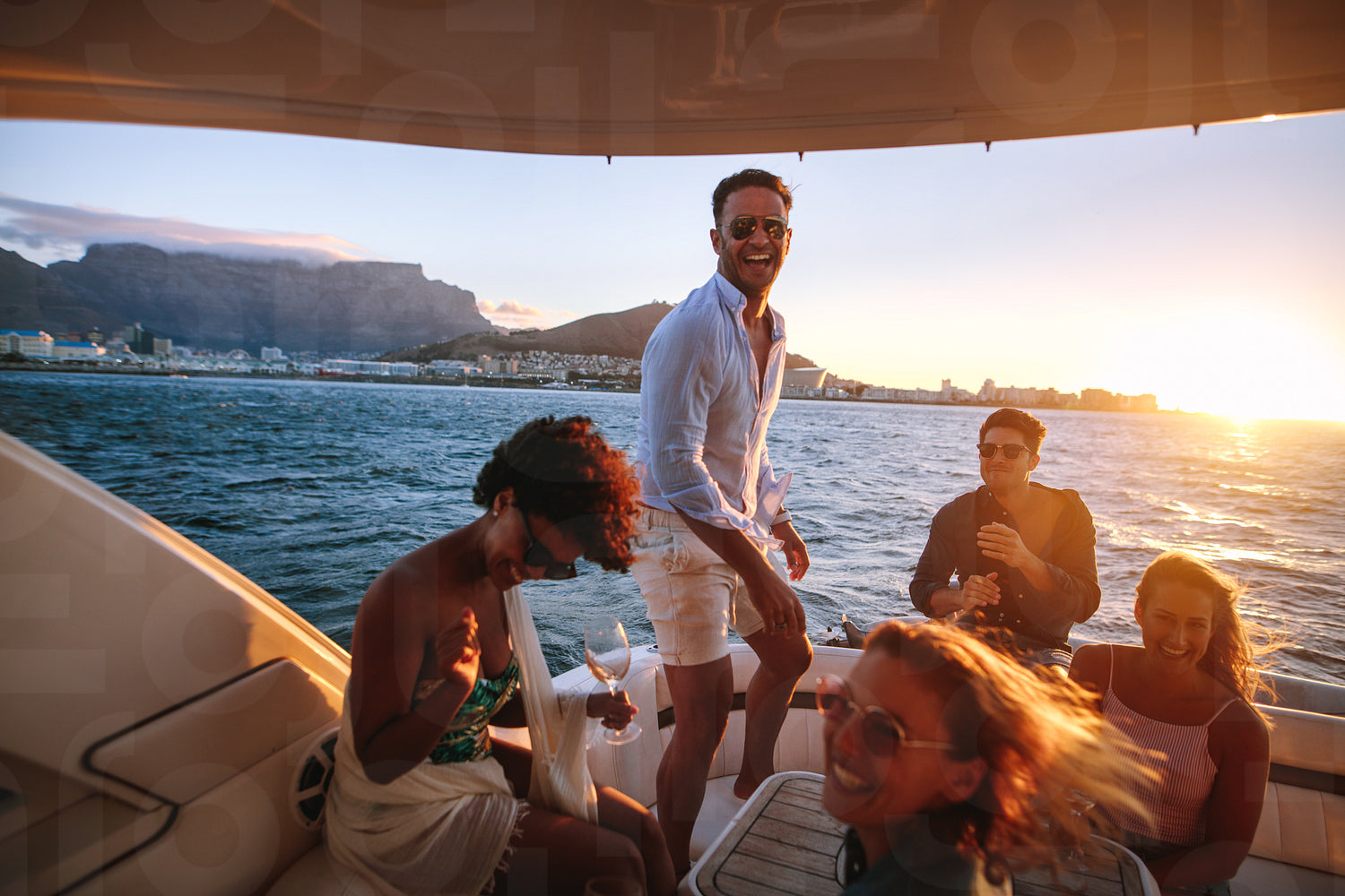 Happy friends drinking and having fun in boat party. Young rich people enjoying sunset boat party.