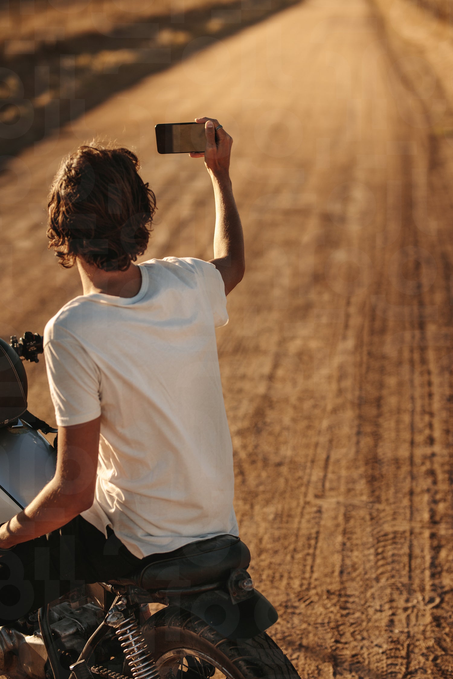Rear view of young man taking selfie with his smart phone while sitting on his motorcycle on country road. Bike rider capturing memories of his countryside ride.