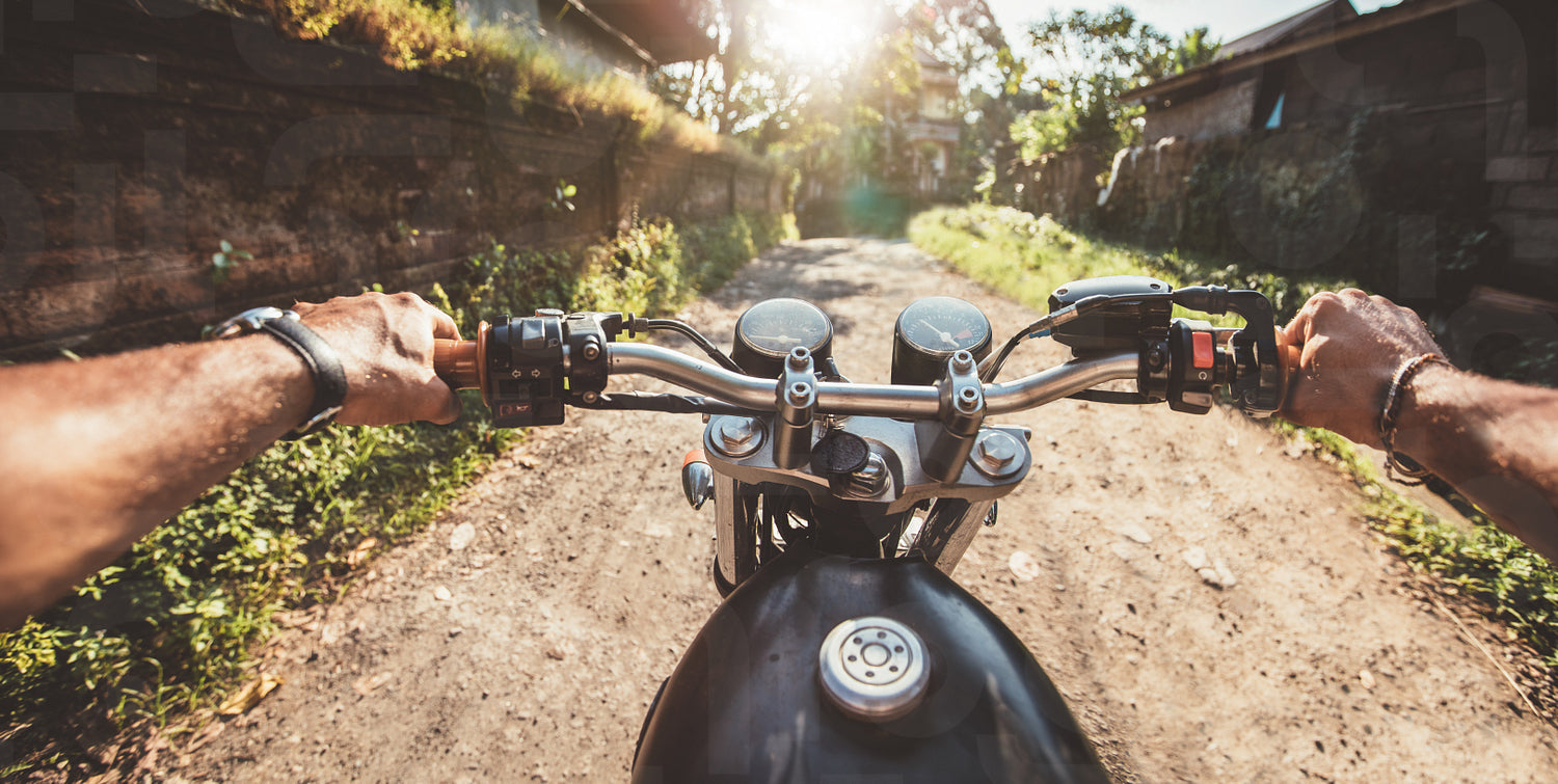 Rider driving motorcycle on a rural road. Point of view shot with focus motorbike handlebar and man hands.