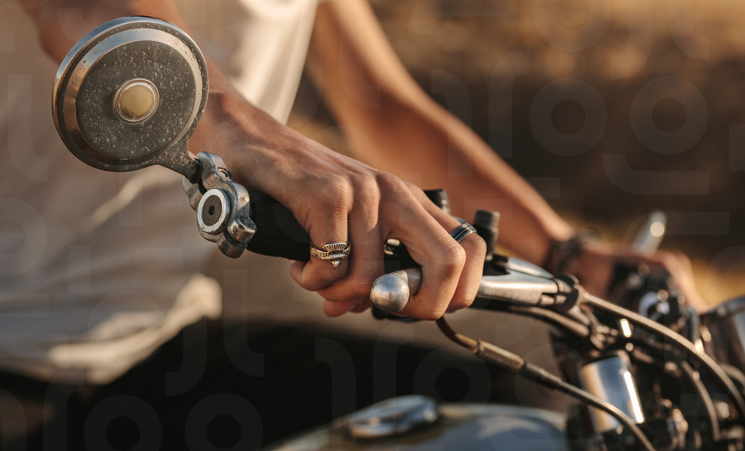 Close up of man holding the handlebars with the front brake lever. Male rider's hand on the handlebar of motorcycle.