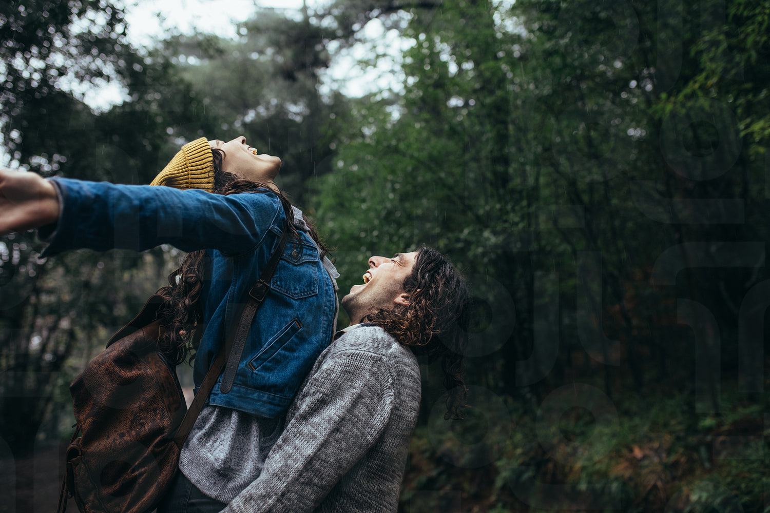 Man carrying his woman with arms outstretched and catching raindrops on tongue. Romantic couple enjoying the rain.
