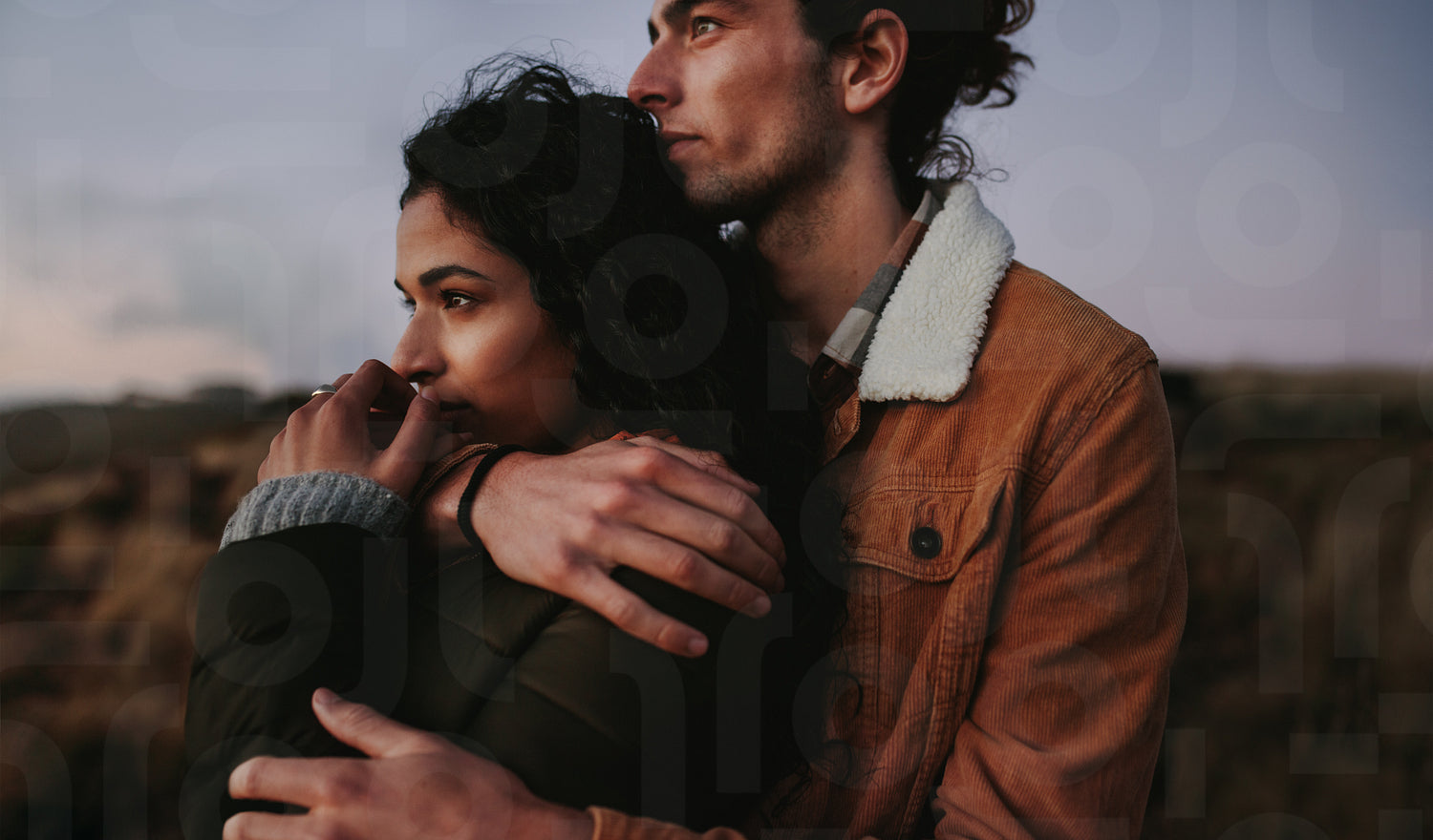 Portrait of couple in love standing together on mountain peak and looking at view. Loving man and woman in warm wear looking at landscape view from mountain.
