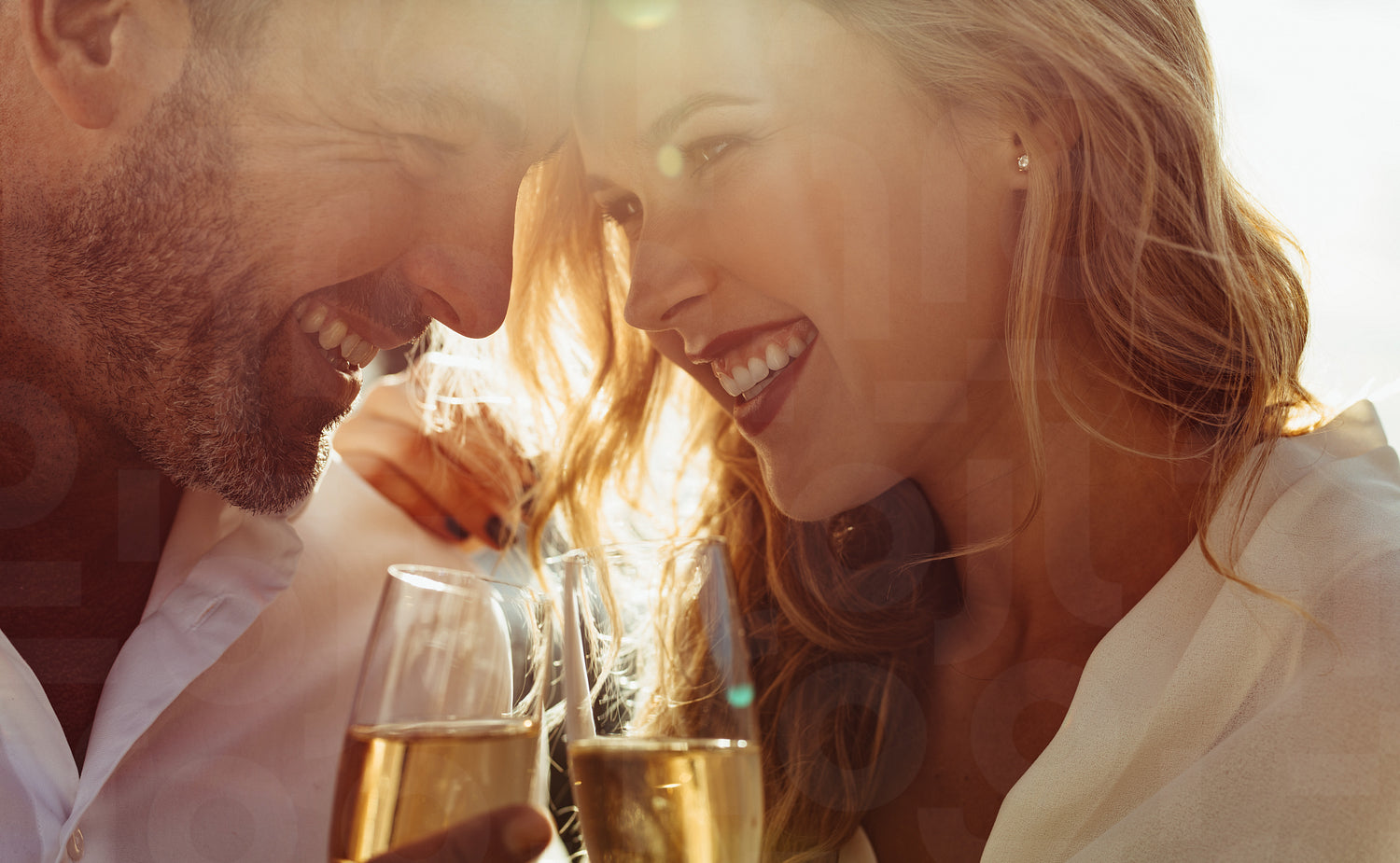 Close up of a romantic couple with their heads together holding a glass of wine. Couple with wine smiling outdoors.