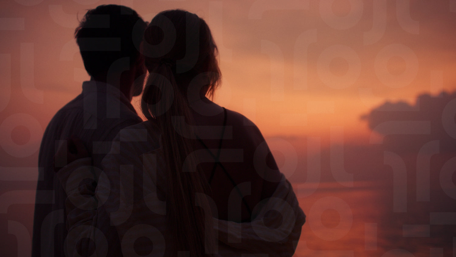 A loving couple stands silhouetted against a vibrant orange and red sunset, gazing at the tranquil ocean horizon. They are in a serene and romantic setting, reflecting on their bond.