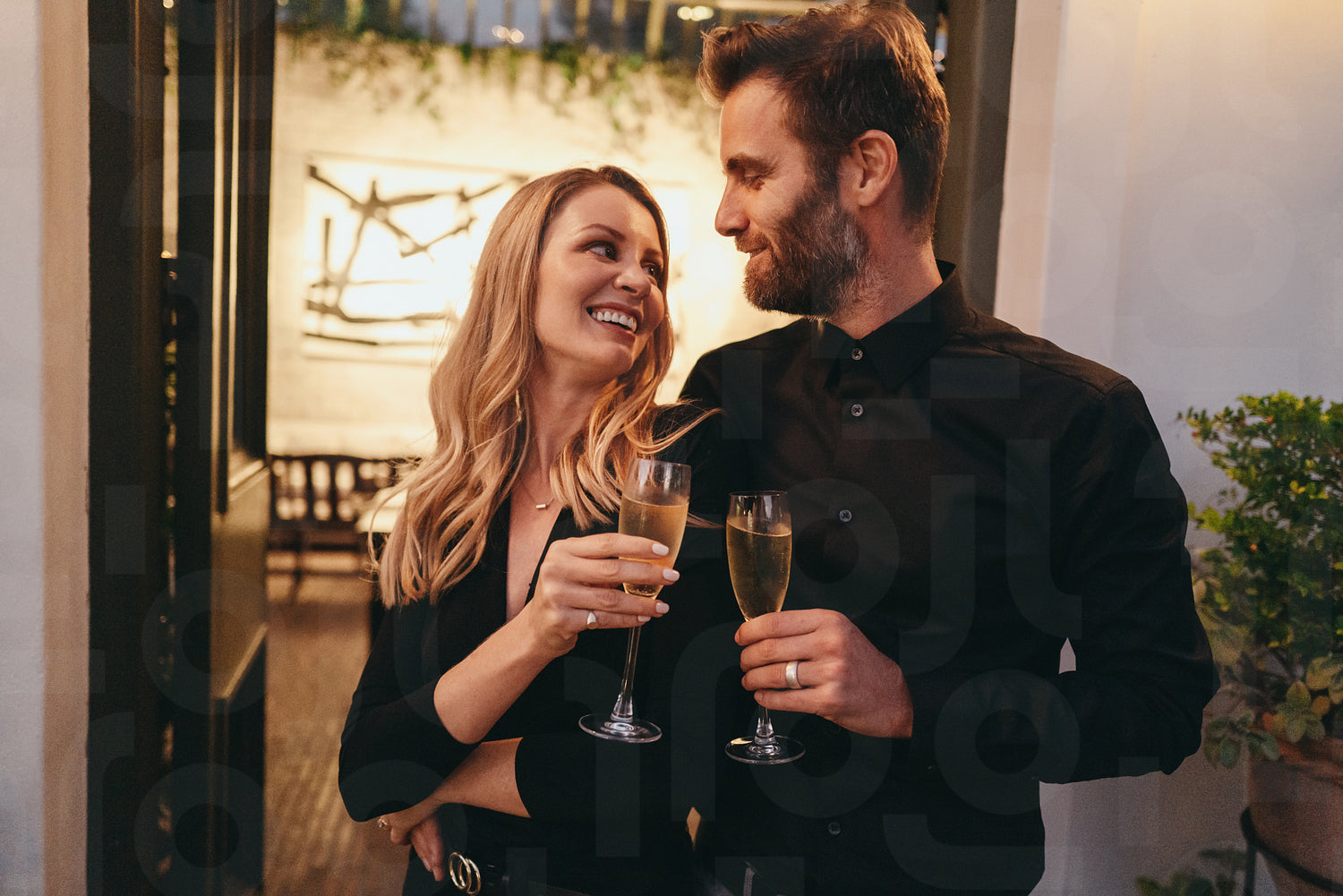Romantic married couple making a toast with champagne glasses while standing at the entrance of a luxury hotel. Happy couple smiling at each other cheerfully. Couple enjoying a weekend getaway.