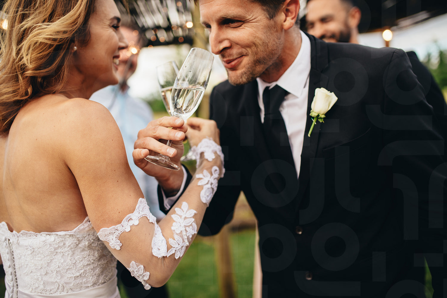 Newlyweds clinking glasses and enjoying romantic moment together at wedding reception outside. Bride and groom drinking champagne at wedding party.