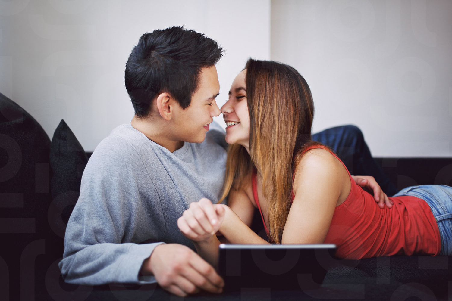 Romantic teenage couple on couch looking at each other with digital tablet. Young couple in lover about to kiss each other on sofa at home. Mixed race man and woman with tablet PC indoors.