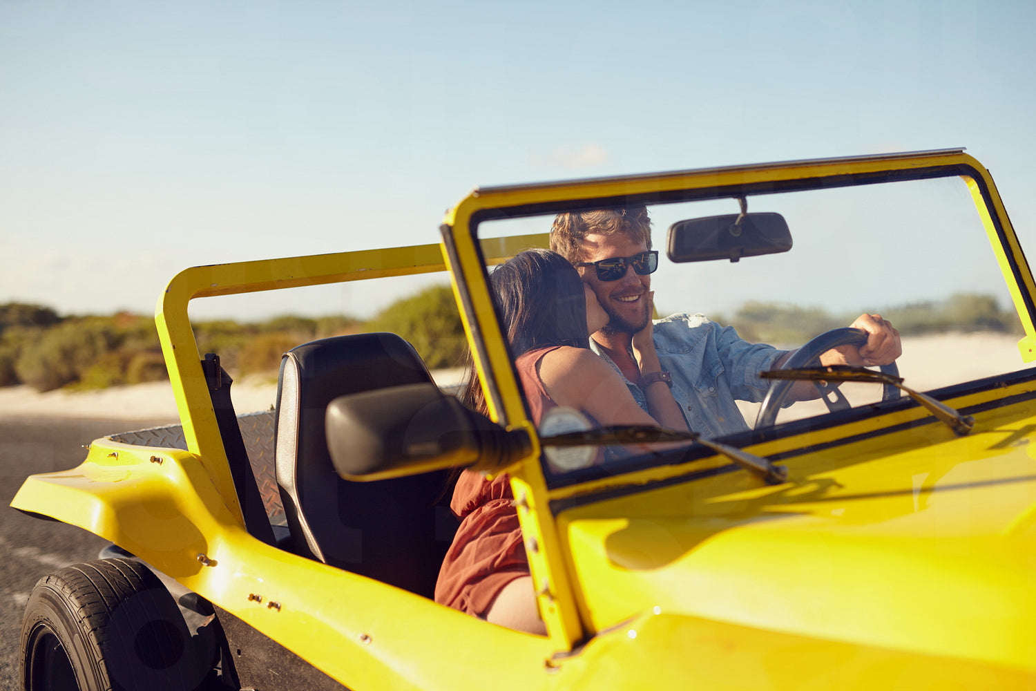 Woman kissing man driving car. Couple on road trip. Romantic caucasian couple on holiday having fun in car.