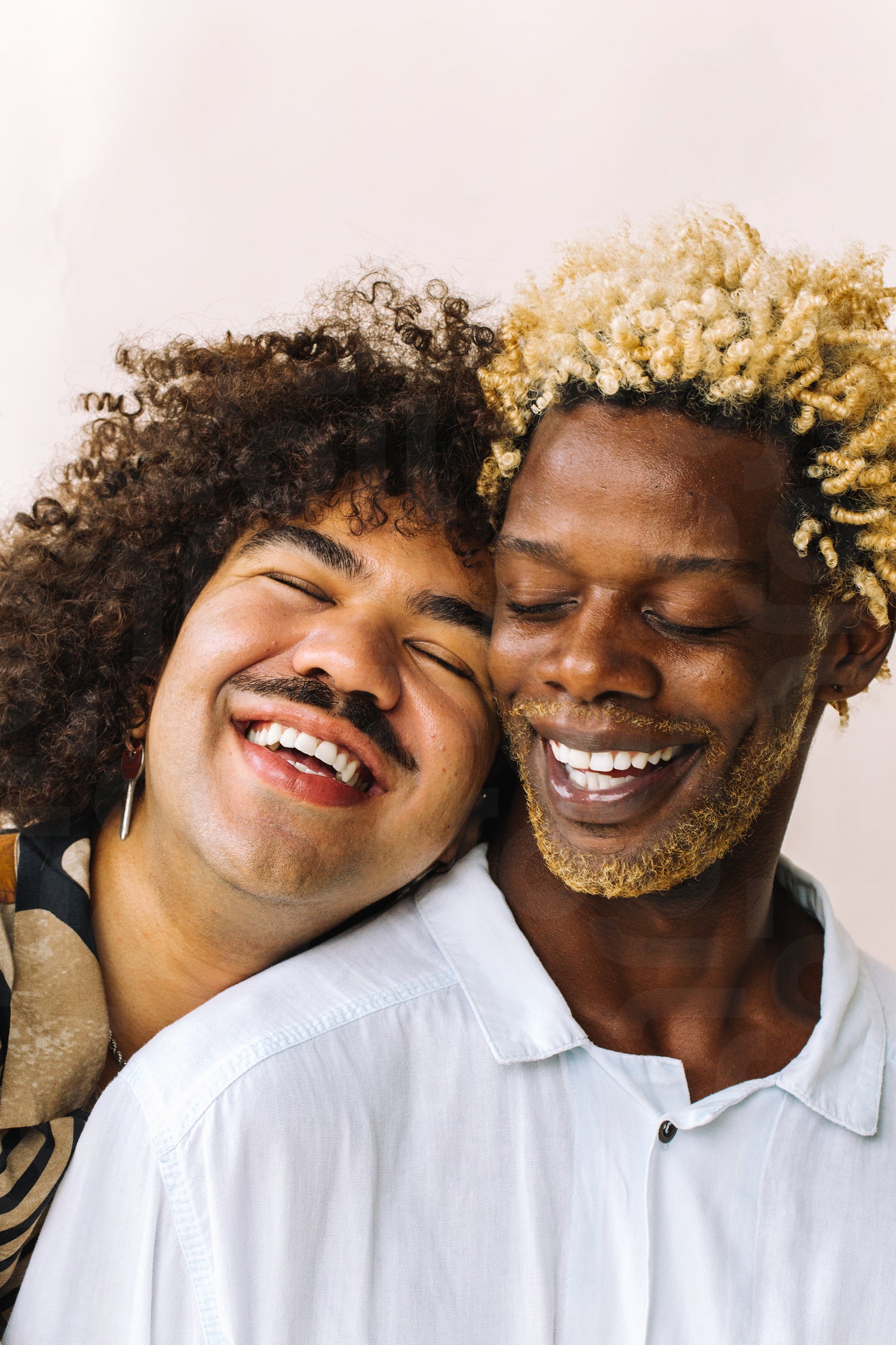 Romantic young gay man leaning on his lover's shoulder in a studio. Two affectionate young male lovers standing together against a studio background. Happy young gay couple smiling cheerfully.