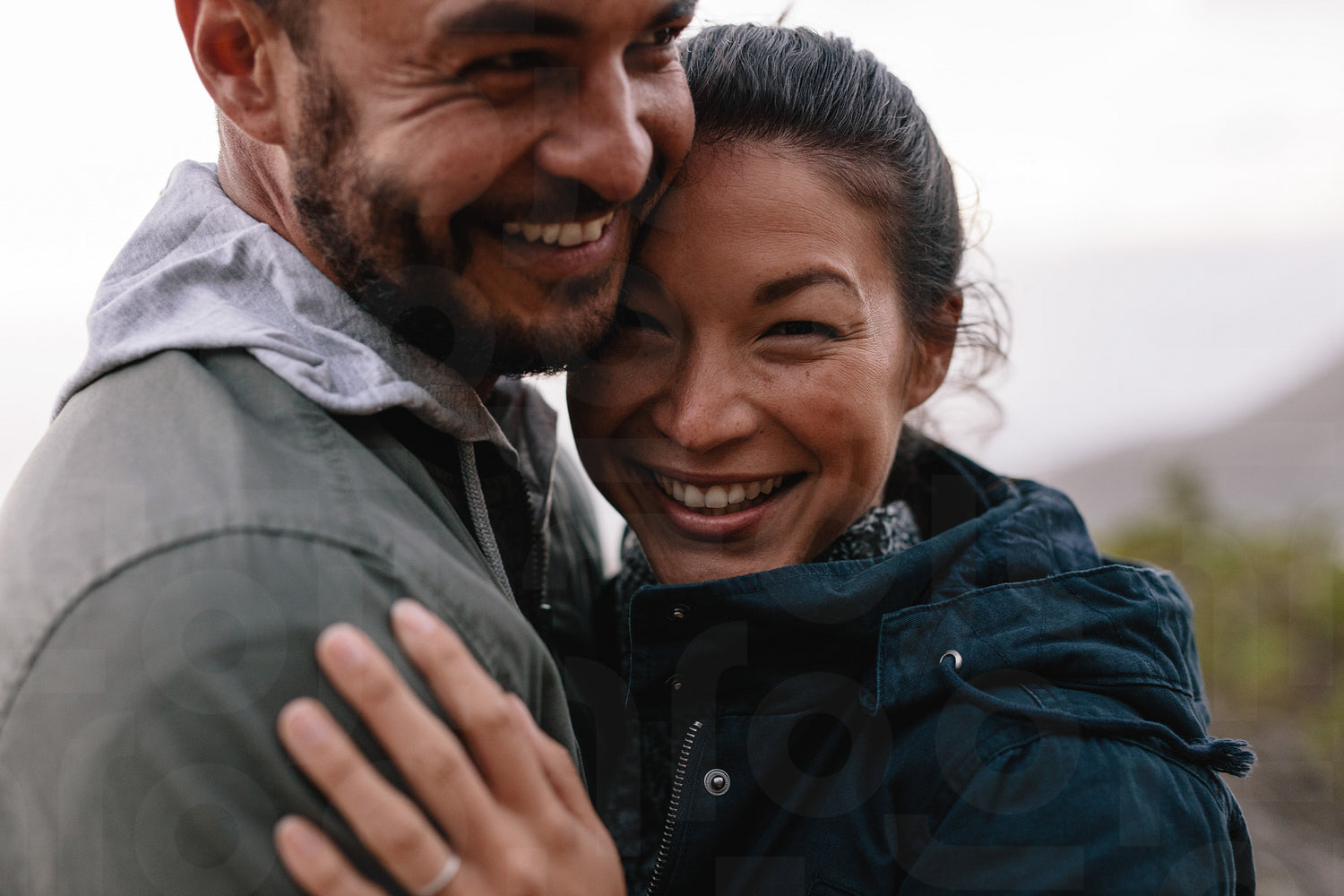 Close up of young couple in love standing together outdoors. Romantic young man and woman embracing in countryside.