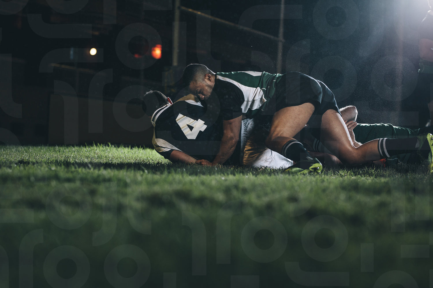 Rugby players fight for the ball on professional rugby stadium. Opponent team players striving for ball in grass field during night game.
