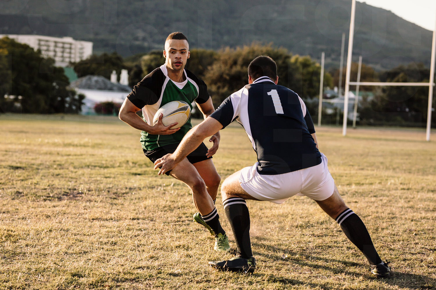 Rugby players tackling during game