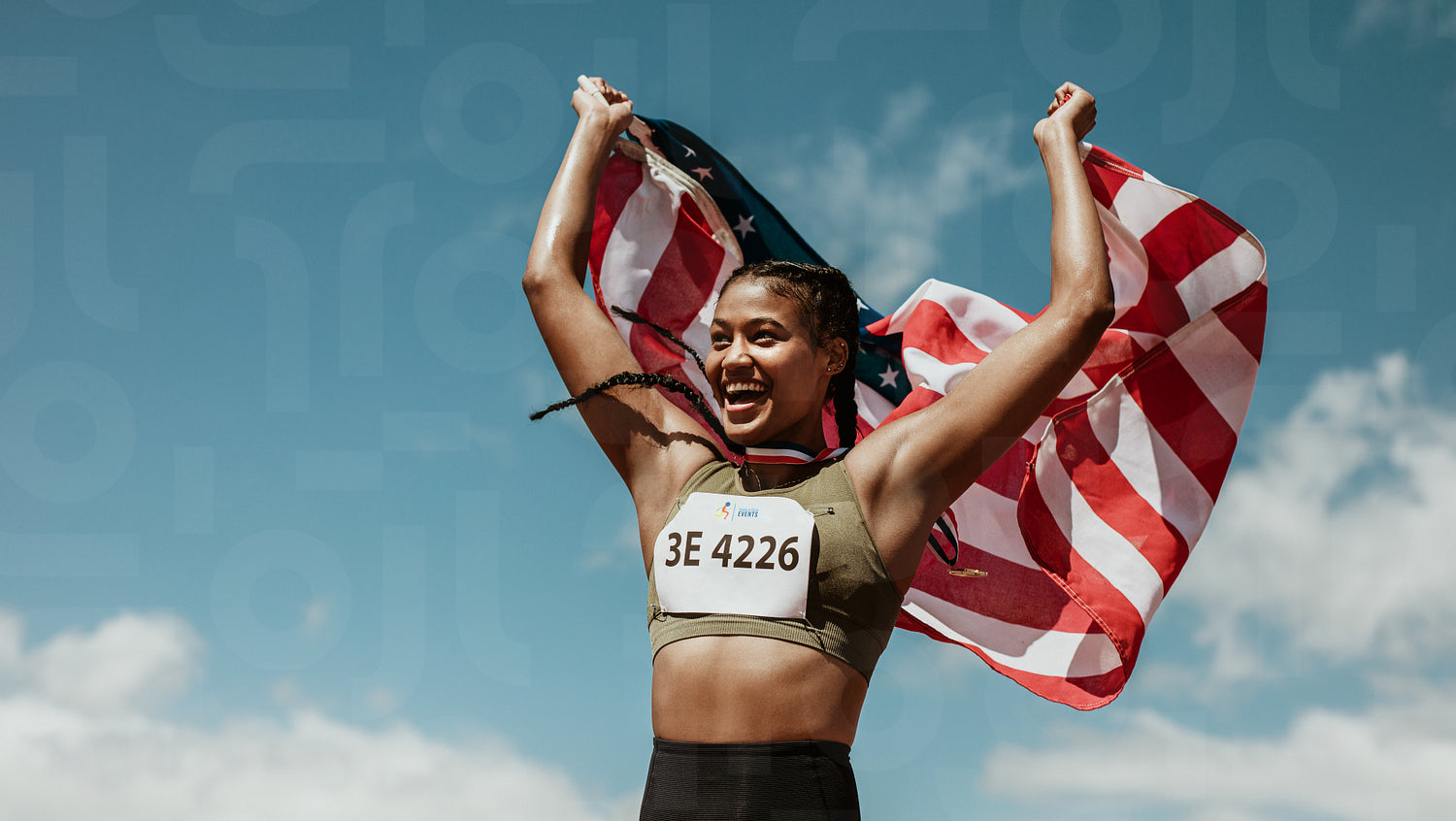 Athlete holding the american flag over the head and smiling. Female runner celebrating victory outdoors holding the US flag.