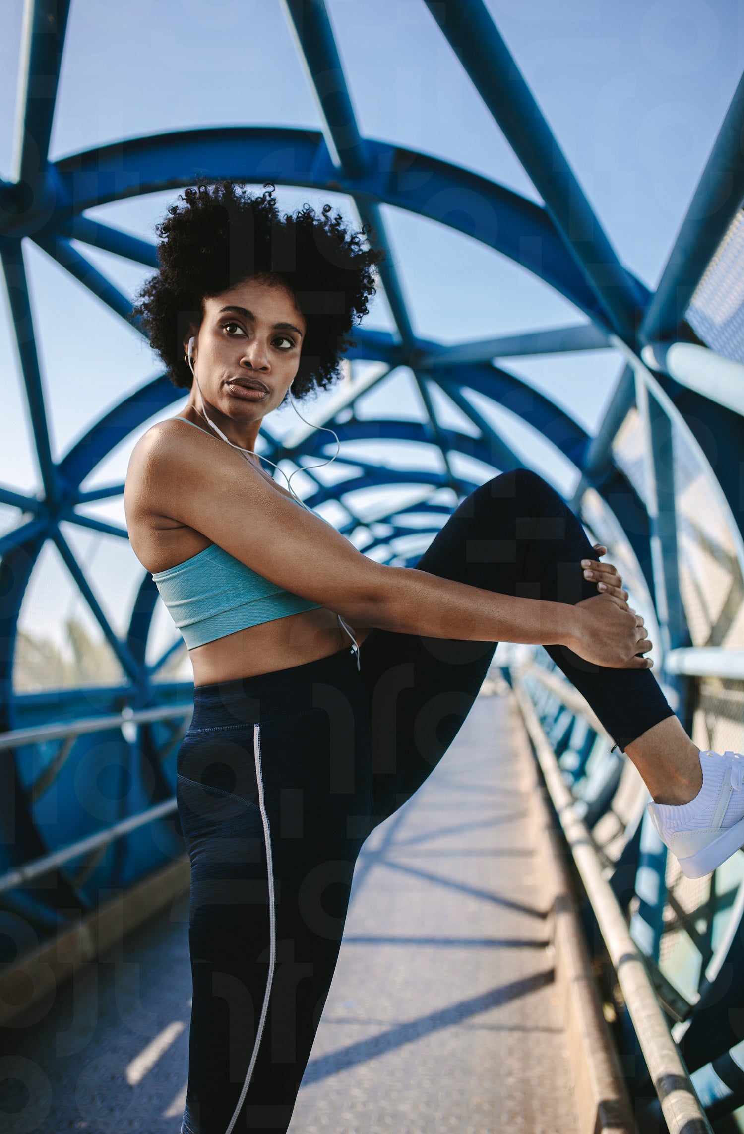 Woman athlete doing fitness workout on a walkway bridge in morning. Fitness woman doing stretching workout of the legs.