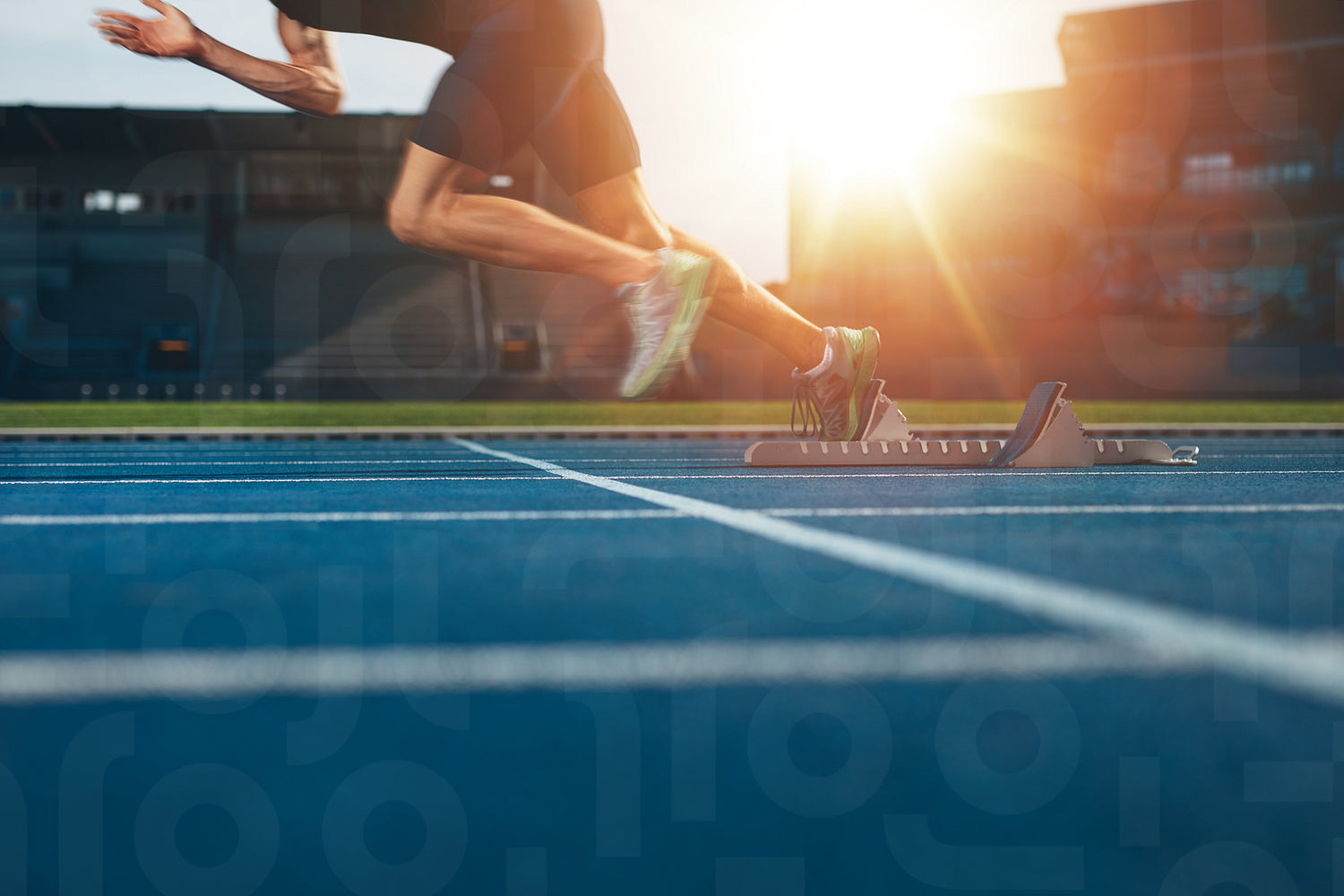 Athlete running on athletic racetrack. Low section shot of male runner starting the sprint from the starting line with bright sunlight.