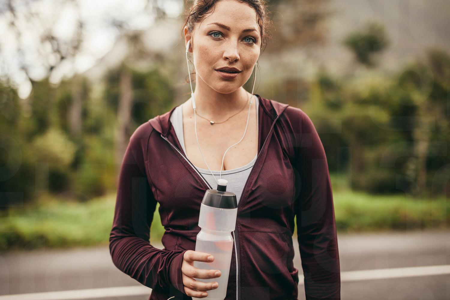 Fitness woman holding a water bottle looking at camera. Runner relaxing after workout in morning.