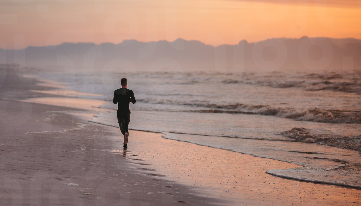 Rear view of man running on the beach in morning. Male athlete on morning run outdoors on seashore.